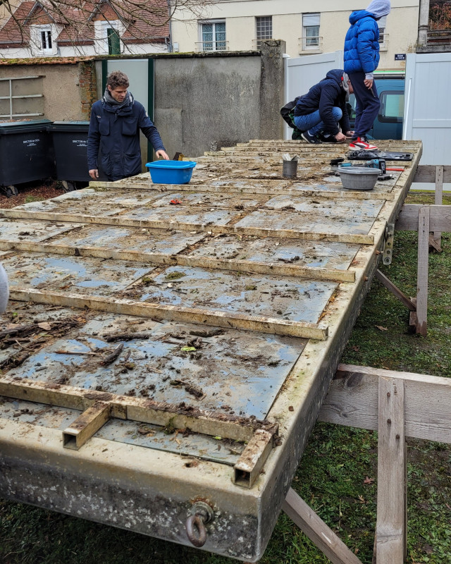 Il a été retiré de l'eau le 14 janvier par les services techniques de la mairie à l'aide d'un chariot élévateur puis, transpoté en camion au club (+ de 500kg quand même).